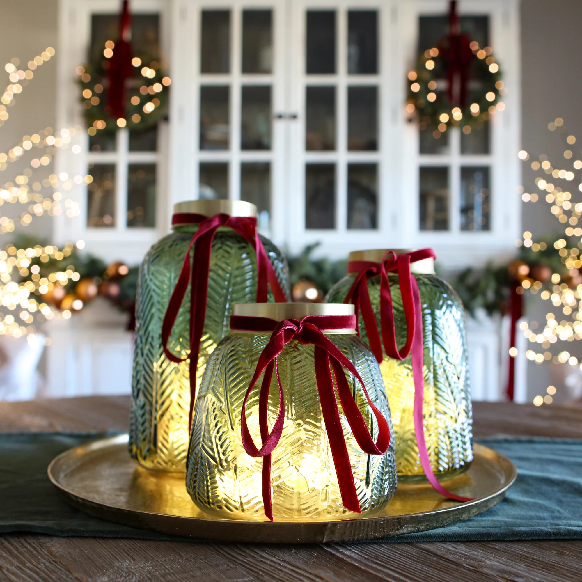 Our Medium Emerald Glass Vase is a versatile piece that combines timeless texture with bold color. The delicate etched leaf pattern adds depth and character, ideal for displaying twinkle lights, slender stems or seasonal branches.