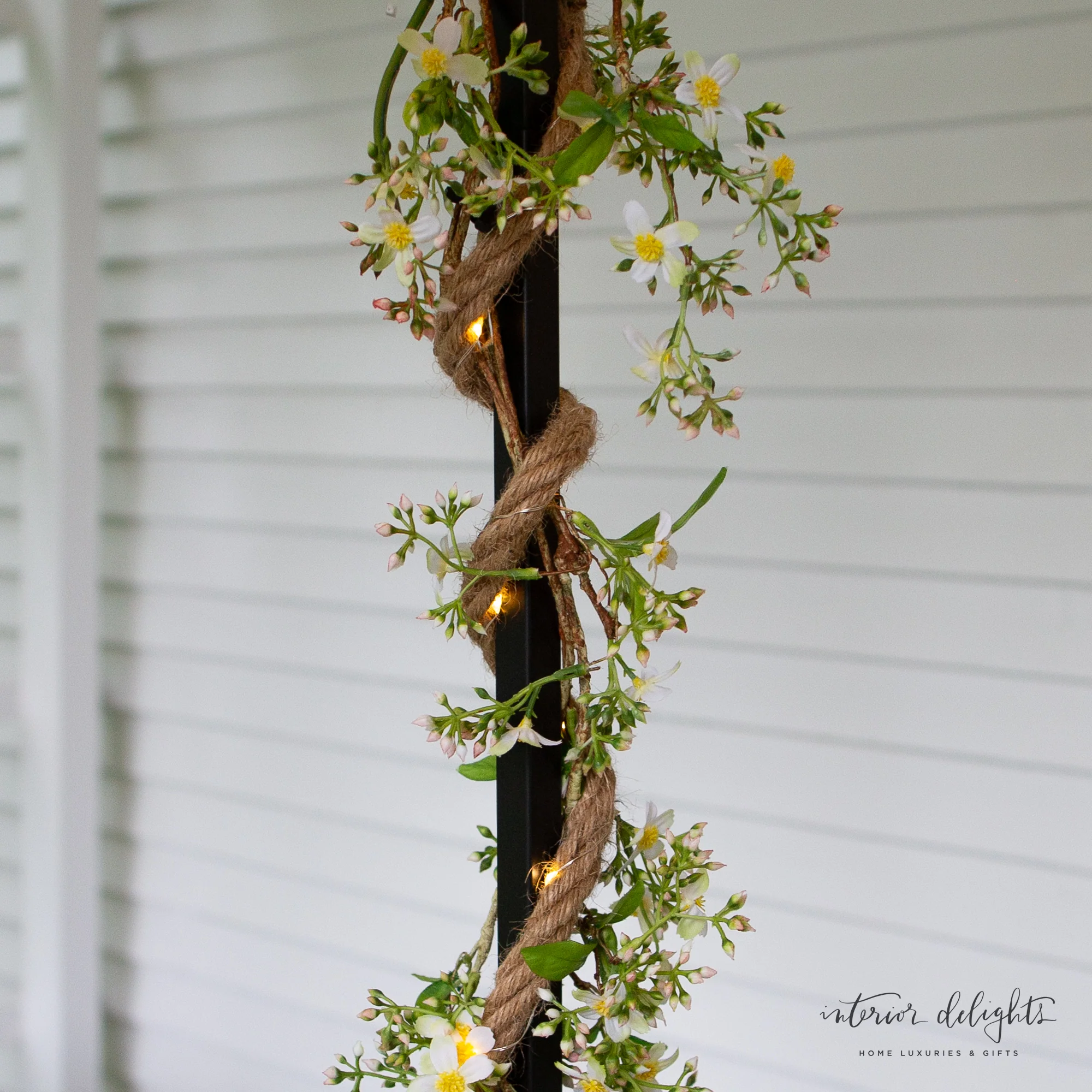 Bring cottage charm to your space with this 5-foot faux garland vine, adorned with soft green leaves, pinkish buds, and delicate white flowers with sunny yellow centers.
