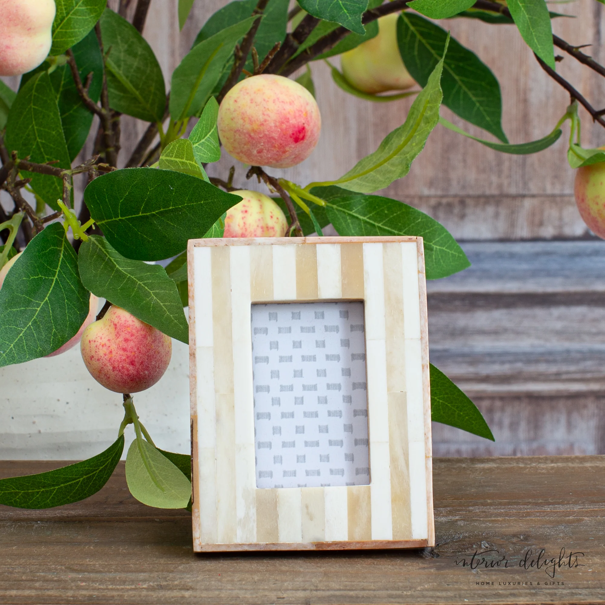 Showcase your cherished memories with this Handmade Two Tone Photo Frame, crafted with beautiful bone inlay stripes for a sophisticated touch. Its elegant design complements any decor, offering a timeless way to display your favorite photo.