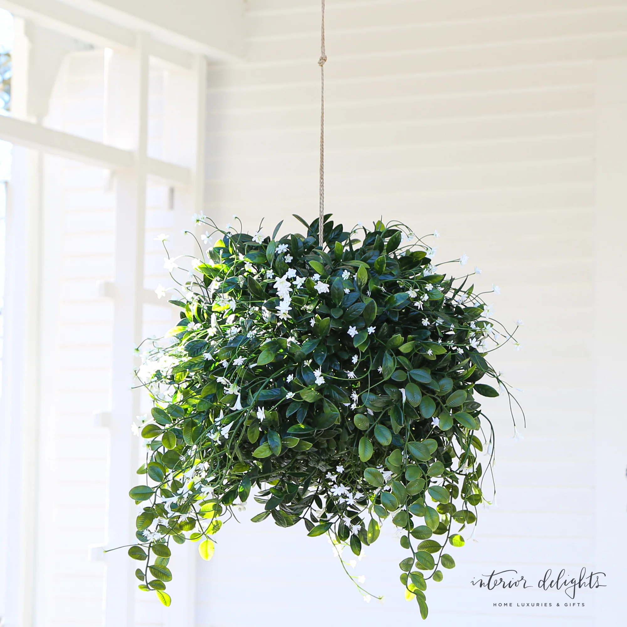 Add charm to your outdoor decor with this lifelike Hanging Boxwood adorned with white trumpet vine flowers and delicate Baby’s Breath. It’s crafted with UV-resistant materials for long-lasting beauty indoors or out—no watering or trimming required.
