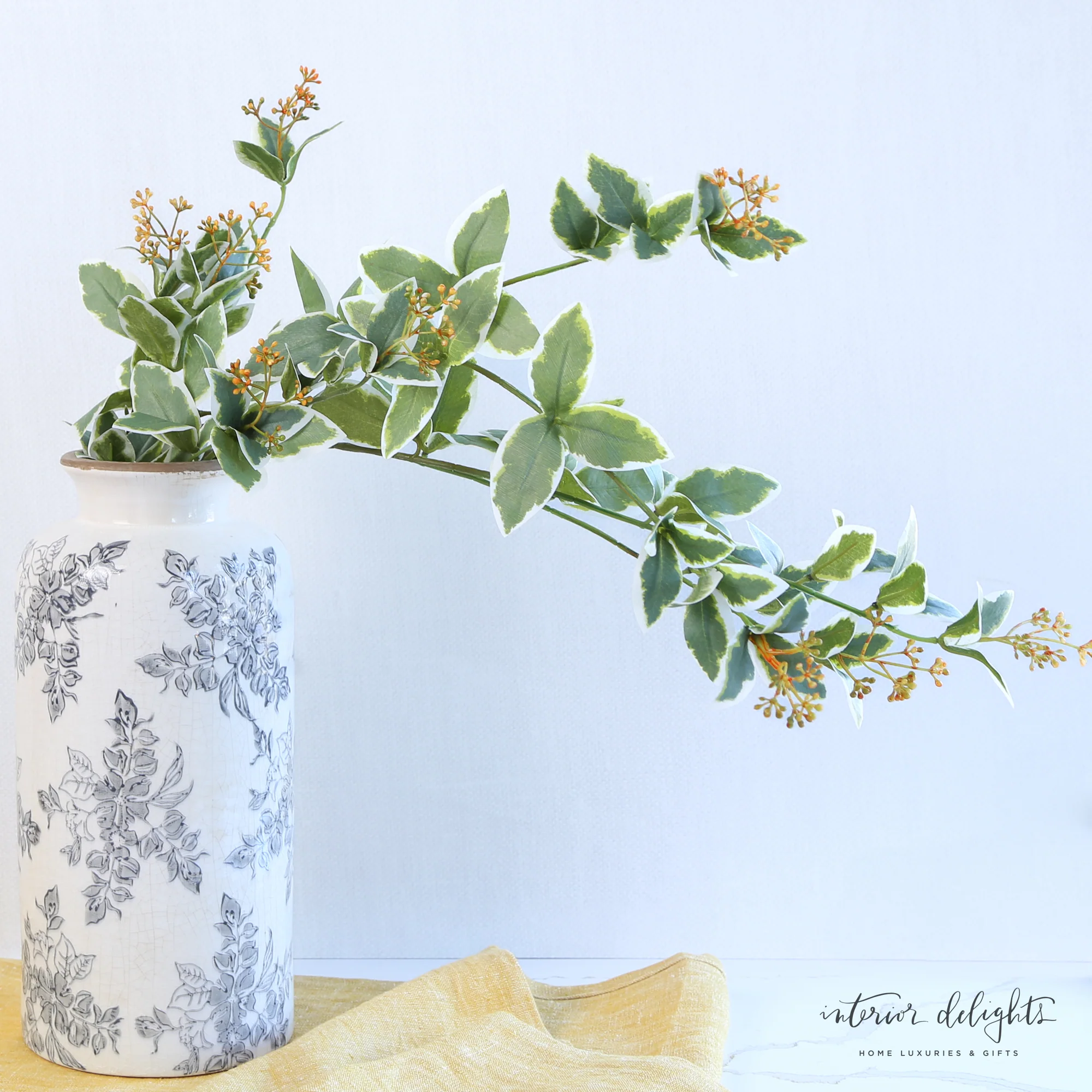 Delicate and romantic, the Hanging Cupid Vine cascades gracefully with lush variegated greenery with new bud growth. Perfect for creating a soft, elegant ambiance in any space. Tuck it into a shelf for natural trailing visual interest.