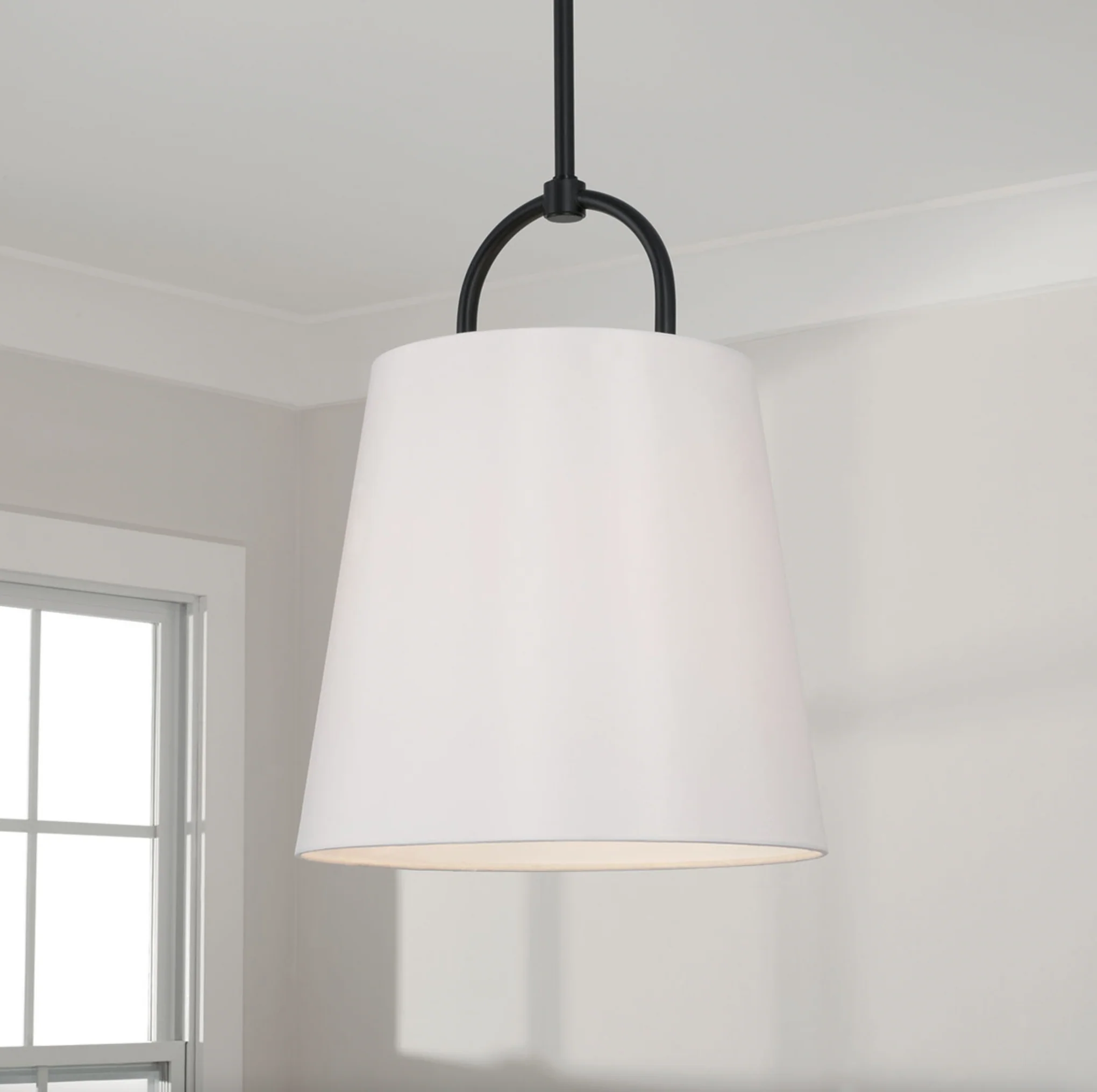 Embodying true minimalist form, the Brody Medium Pendant brings sleek, simplified style. The Matte Black finish enhances the classic look of the white fabric shade to deliver sophisticated, less-is-more design. The open arched top meets again just below the shade to form a single socket, creating this unique look while balancing the pendant's light source.
