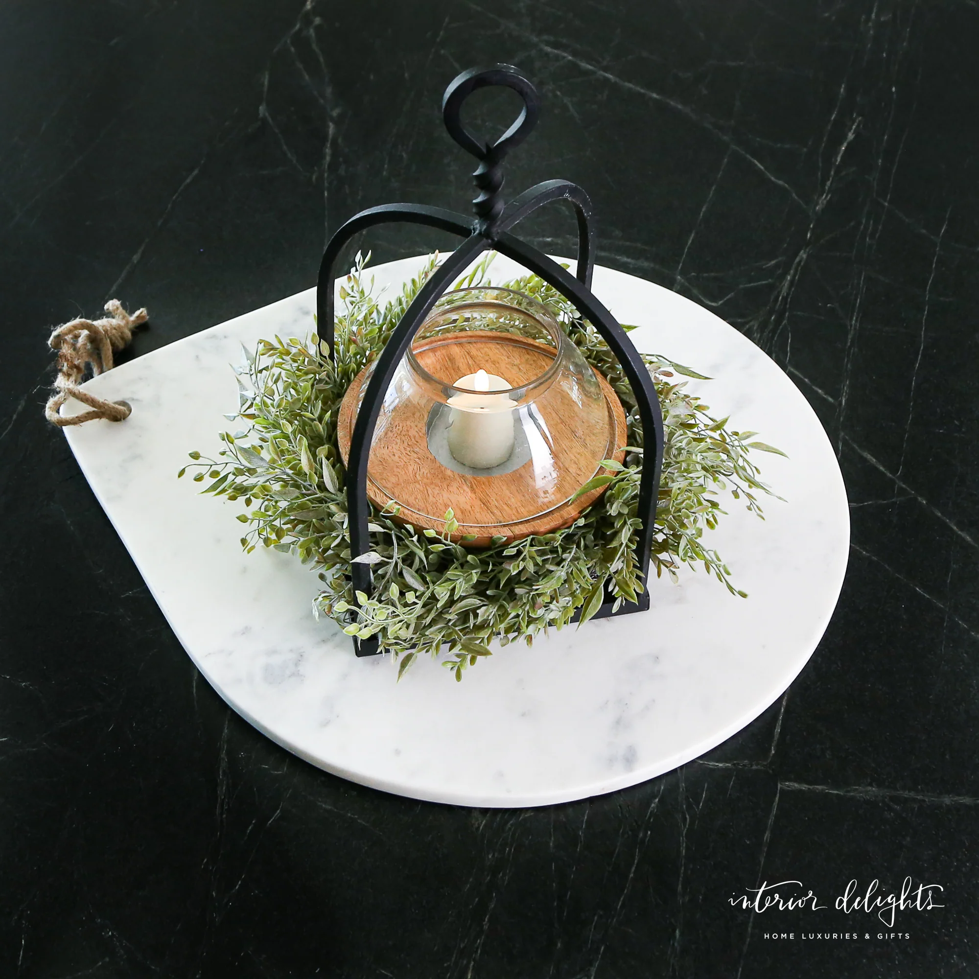 Our Twisted Top black iron lantern is just the right size for countertops and shelves, adding a cozy glow to smaller spaces. Its dark finish contrasts beautifully with light walls and backsplashes and pairs perfectly with our candle rings.