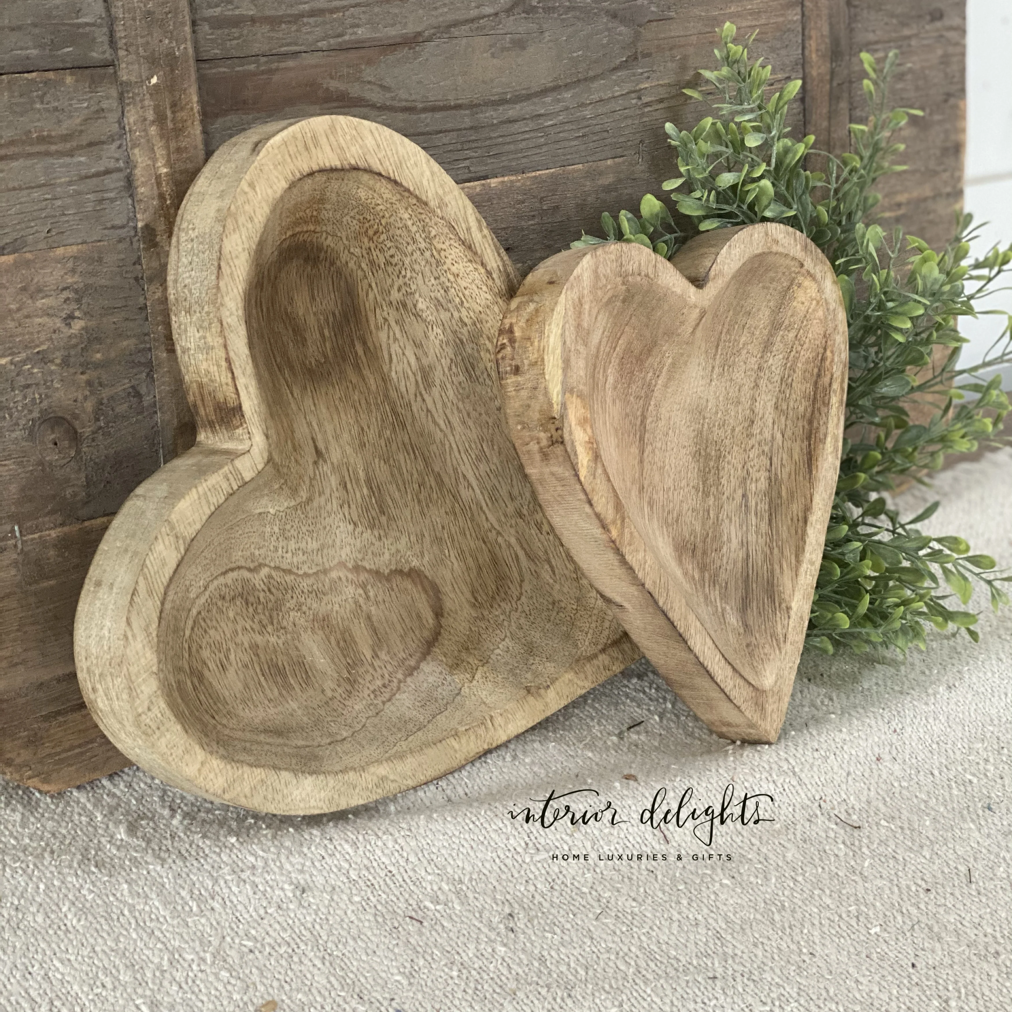 This beautiful set of wooden carved hearts makes a great gift and looks beautiful on any flat surface or propped in the background of a shelf. There are little felt pads on the back to prevent scratching.