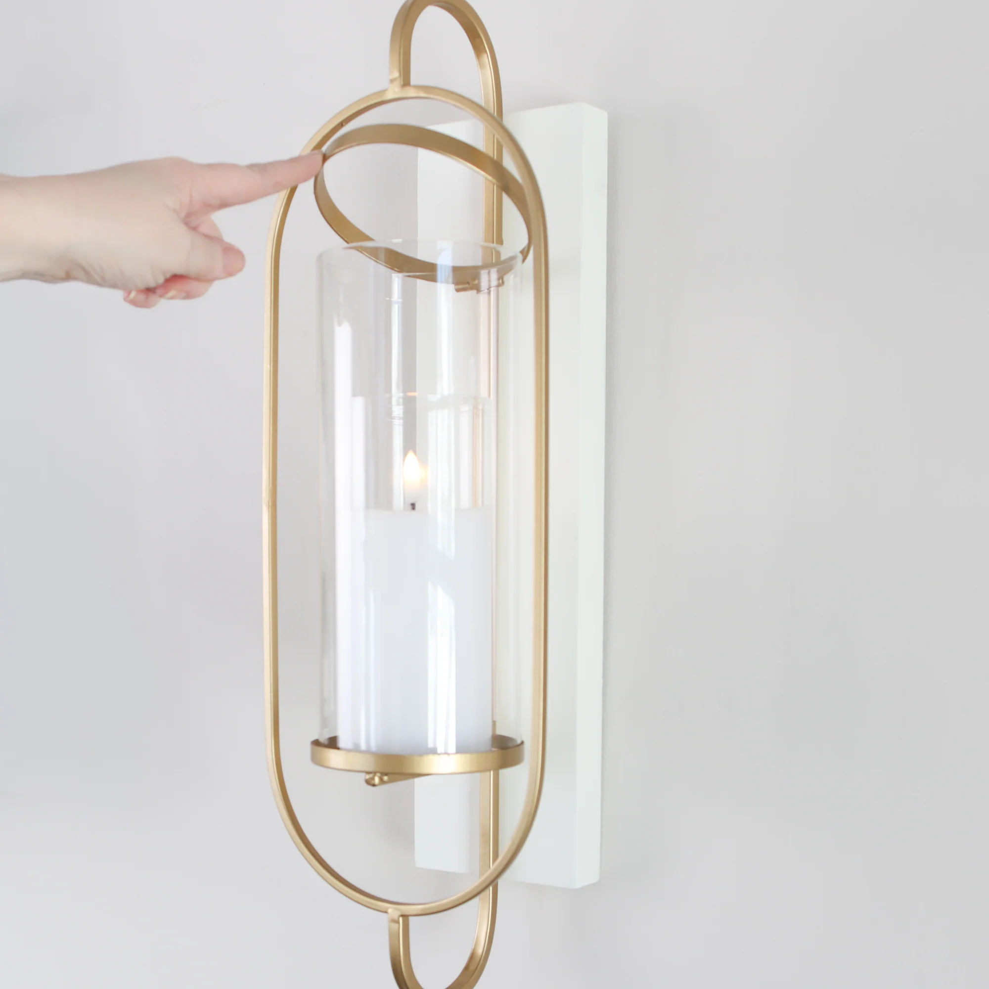 Our White and Gold Wall Sconce brings refined elegance and warm glow to indoor spaces. Featuring a satin gold iron frame with glass and white fir wood base, it adds height and architectural interest to walls and entryways.